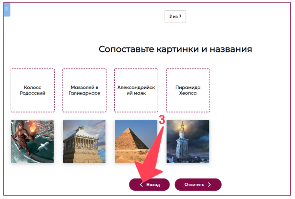 Участники смогут возвращаться к прошлым вопросам с помощью кнопки “Назад”(3) в нижней части теста: