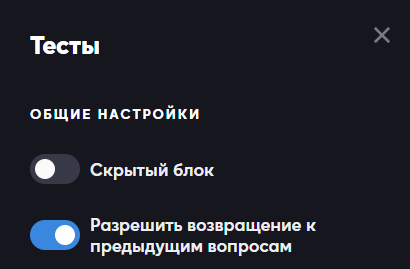 Есть функция навигации по вопросам: кнопки «Назад» и «Далее». Данная функция позволяет вернуться к предыдущему вопросу и изменить ответ/выбранный вариант. Чтобы активировать её для «Теста» , необходимо зайти в настройки соответствующего блока.