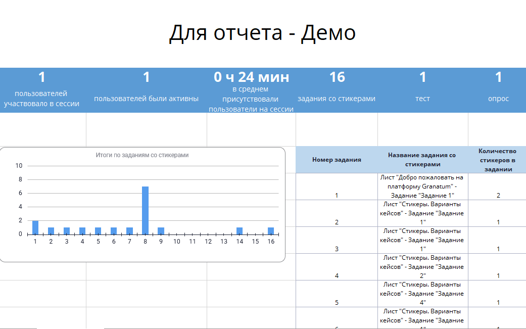 - Таблица и гистограмма «Итоги по заданиям со стикерами».
