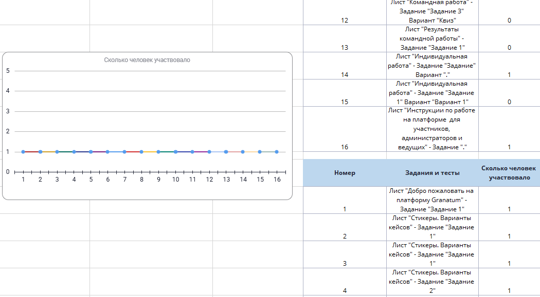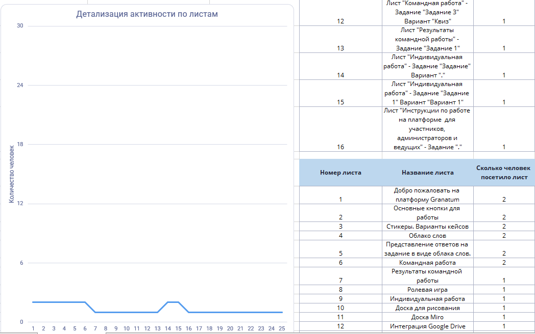 - Таблица и график «Сколько человек участвовало». Учитываются только пользователи, добавившие стикер, прошедшие опрос или тест самостоятельно на общем или индивидуальном листе, а также те, кто был онлайн во время ответа команды на командном листе.