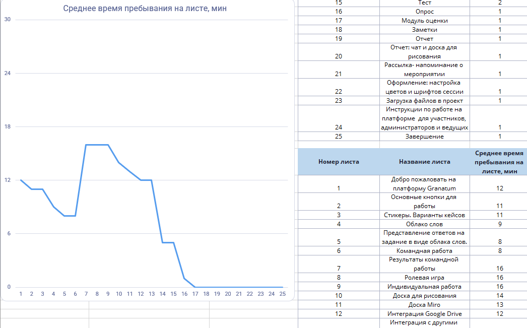 - График и таблица «Среднее время пребывания на листе». Это поможет понять, на каком листе пользователи проводили больше всего времени. Учитываются только обычные пользователи. Среднее время считается как сумма времени всех обычных пользователей, которые были на листе, делить на количество этих пользователей.