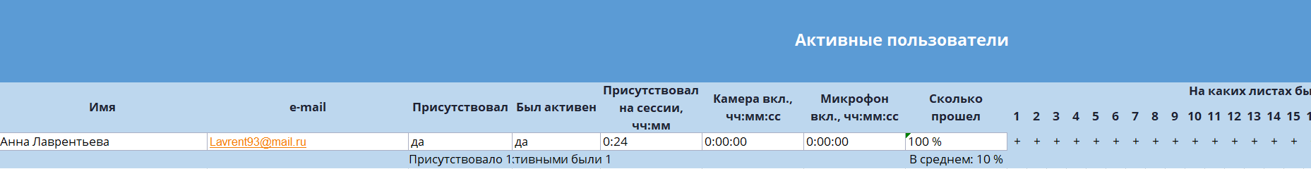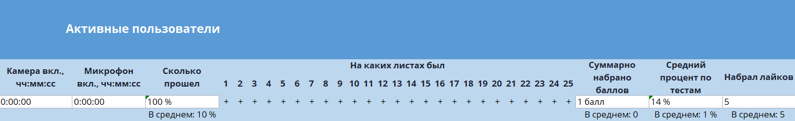 - Время присутствия пользователей на сессии. Рассчитывается среднее время присутствия (время присутствия каждого пользователя суммируется и делится на количество присутствующих пользователей) Администраторы не учитываются.