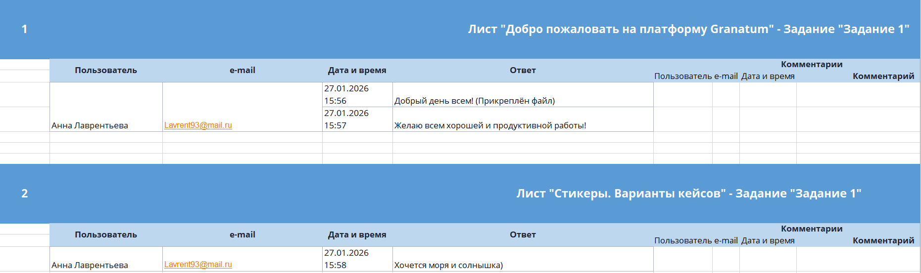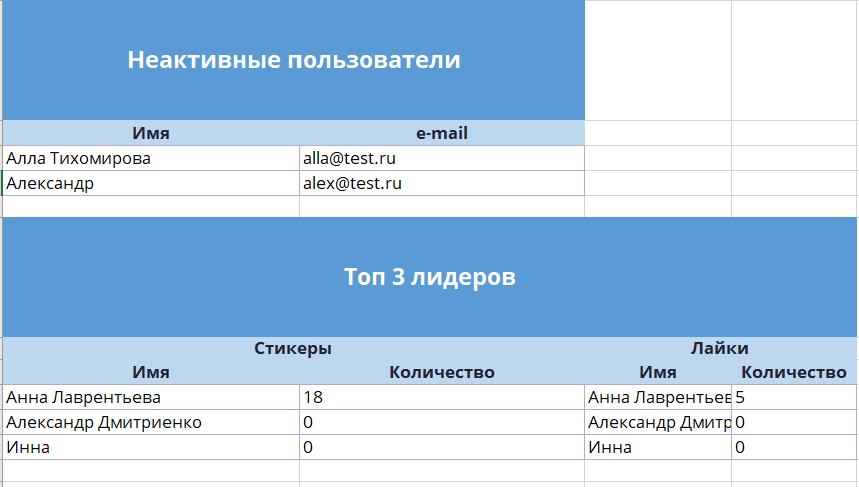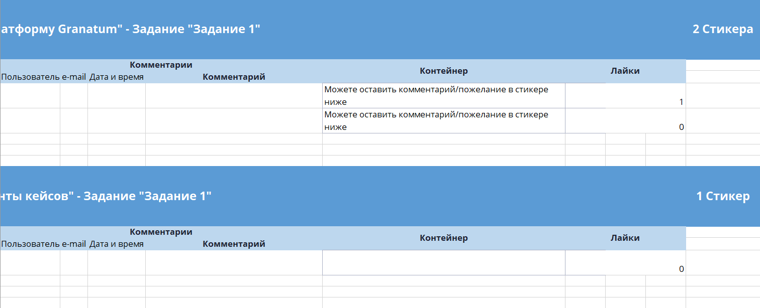 Если задание находилось на общем или индивидуальном листе, то в таблице указываются имена пользователей, если команды лист — то названия команд и имя пользователя, который оставил стикер. Также по каждому заданию рассчитывается суммарное количество стикеров.