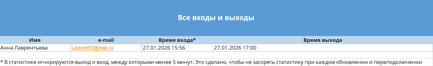 Важно: В статистике игнорируются выходы и входы, между которыми менее 5 минут. Это сделано, чтобы не засорять статистику при каждом обновлении и переподключении. Время указано по вашему часовому поясу.