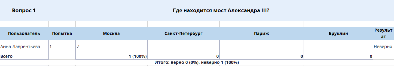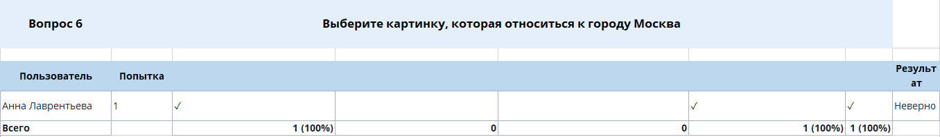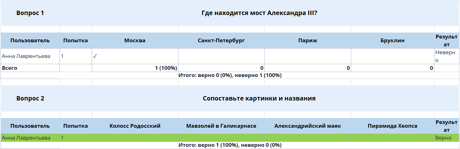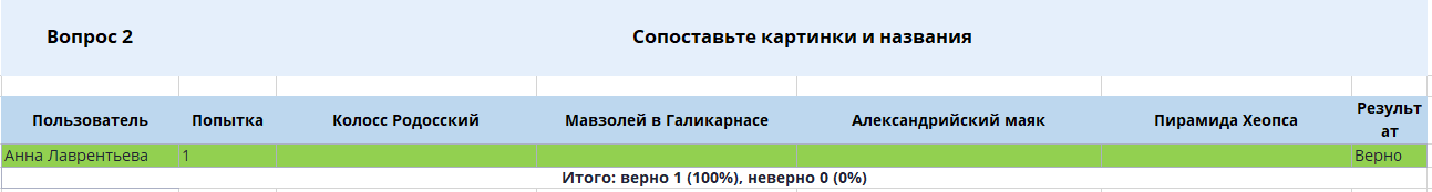 В отчете по сессии указываются все попытки прохождения теста и выделяется, верно или нет ответил пользователь. Если ответ верный, то он выделяется зеленым цветом.