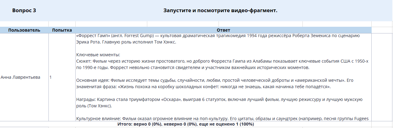 - Вопросы типа “развернутый ответ” — приведены ответы пользователей, которые написаны ими вручную. Обращаем внимание, что если ответ не оценен администратором, то в отчете будет указано как “не оценено”