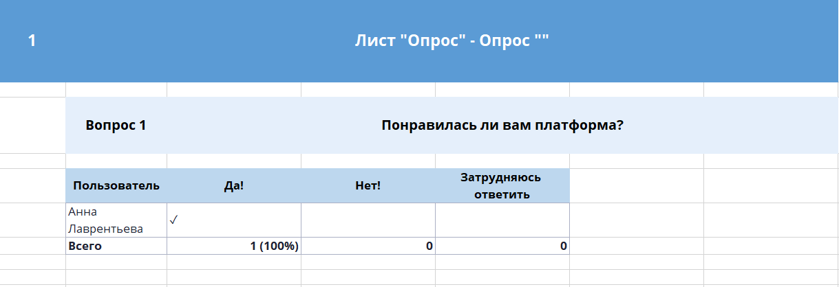 В верхней голубой плашке название Опроса, ниже таблица с названием и нумерацией вопроса, пользователями ,вариантами ответов пользователей.