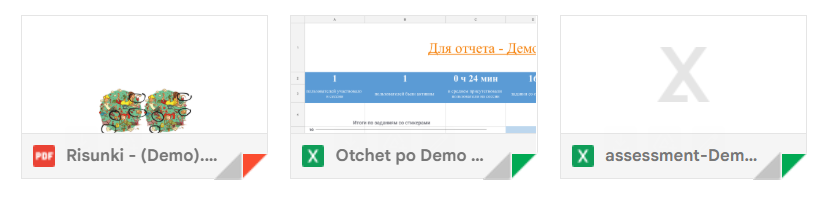 Отчет приходит на почту в виде трех файлов: чат и отчет в формате эксель и файл с доски для рисования под названием “Risunki” в формате PDF.