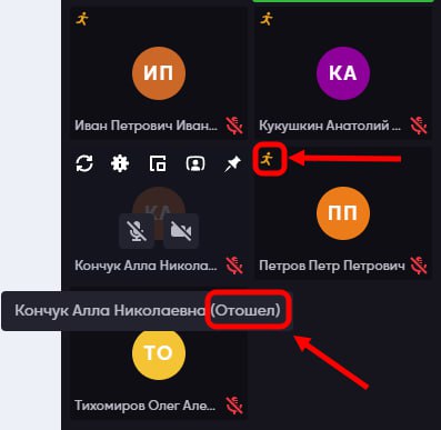 Если вы направите мышкой на иконку убегающего человечка, то высветится ФИО участника и (Отошел).