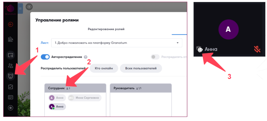 Для автоматического распределения участников по ролям нажмите кнопку «Автораспределение» (1) и выберите источник: «Кто онлайн» или «Всех пользователей» (2).