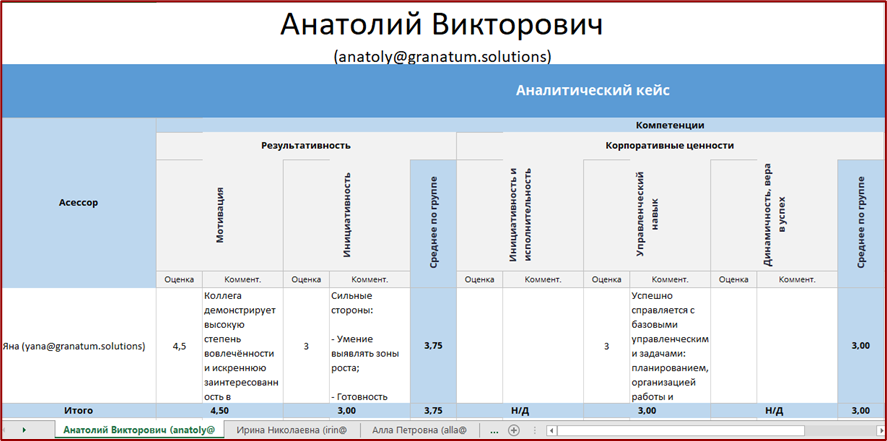 Отчет формируется в формате Excel, где каждый лист соответствует ФИО участника. В левой части листа указаны ассессоры, а в правой — компетенции с оценками и комментариями. Итоговая оценка отображается в строке «Итого» только при использовании числовых значений. Для текстовых оценок в итогах указывается «Н/Д» (недоступно).