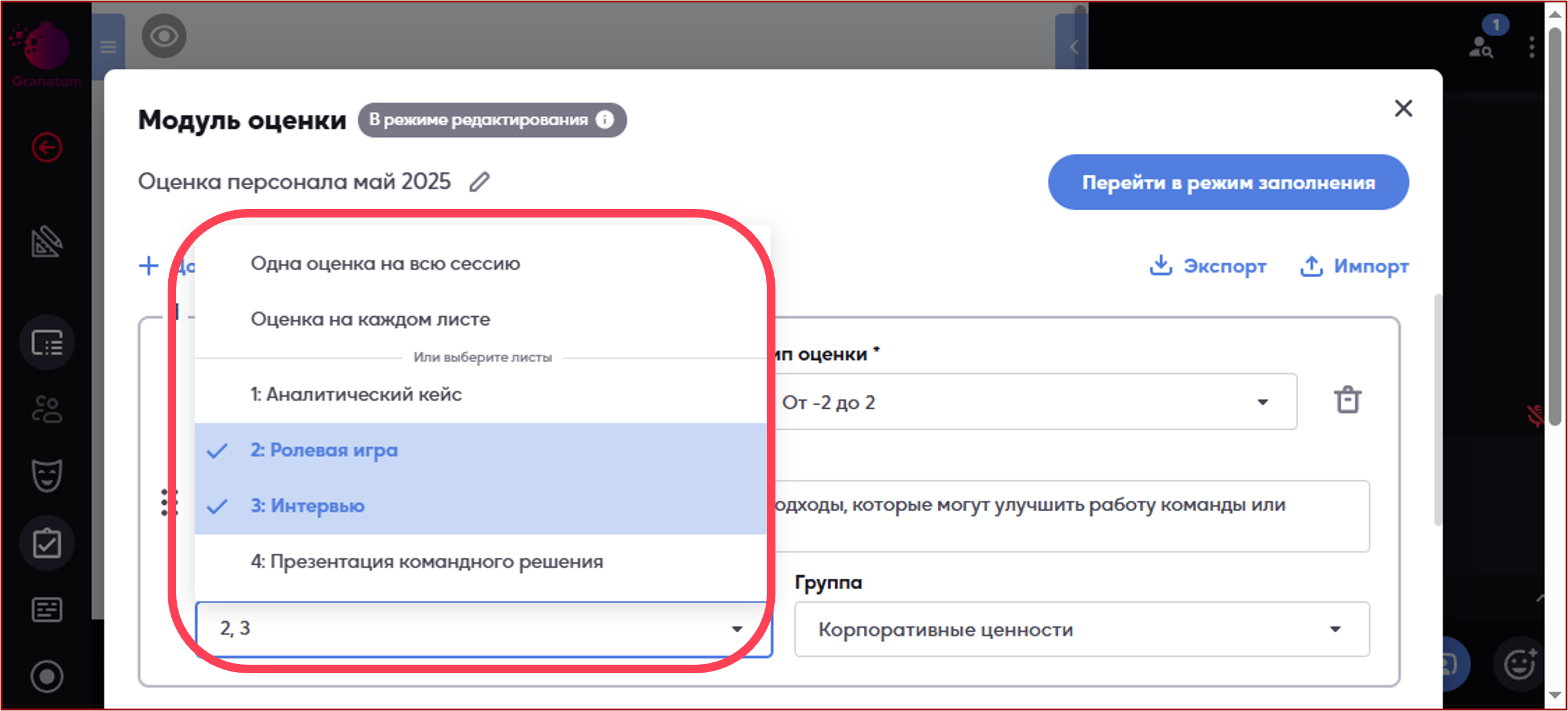 Вы можете настроить модуль оценки с максимальной гибкостью: привязать его ко всей сессии целиком или выборочно к конкретным листам, например, к этапам «Ролевая игра» и «Интервью».