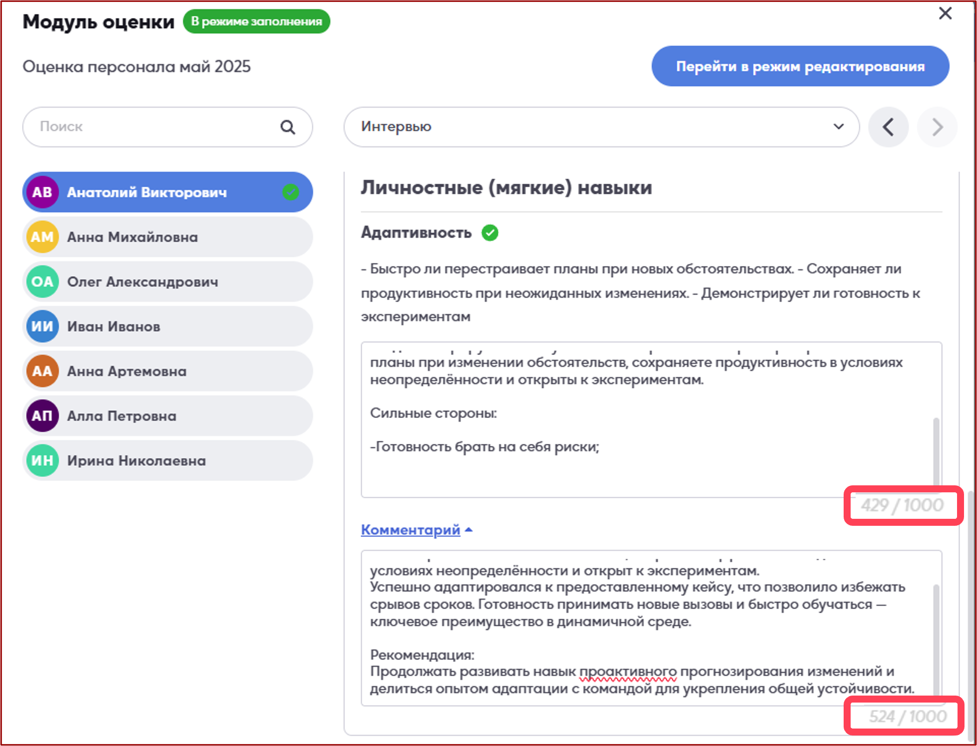 Размер области для ввода тестовых оценок и комментариев до 1000 символов. В заполняемом поле эта информация будет отображаться в правом нижнем углу.