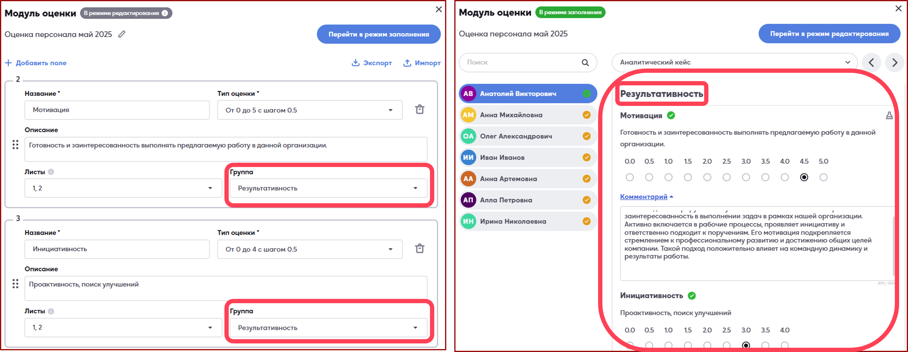 Благодаря полю «Группа» компетенции можно объединять в категории. Например, «Мотивация» и «Инициативность» можно отнести к группе «Результативность». При заполнении формы все соответствующие компетенции будут показываться вместе. Это даёт возможность создавать оценки по нескольким уровням.