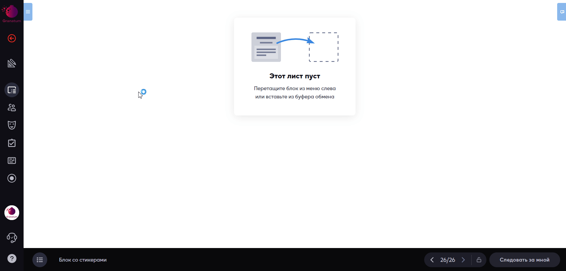 Блок «Стикеры» позволяет участникам сессии оставлять заметки в режиме реального времени. Этот инструмент идеально подходит для мозговых штурмов, голосований или коллективного обсуждения вопроса.
