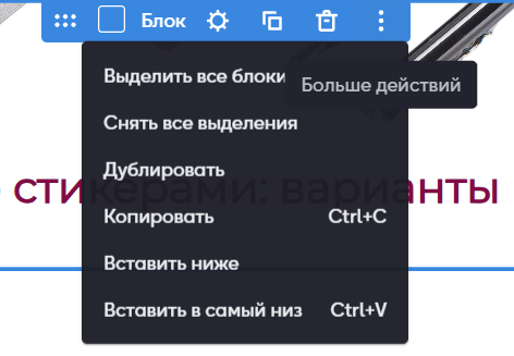 У контейнера для стикеров внутри блока также имеется панель инструментов. Она открывается слева при клике на контейнер мышкой.