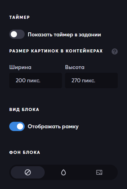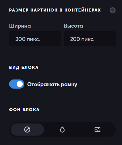 Размер картинок в контейнерах можно менять в соответствующих полях в настройках блока. Если оставить поля незаполненными — картинка растянется по ширине контейнера.