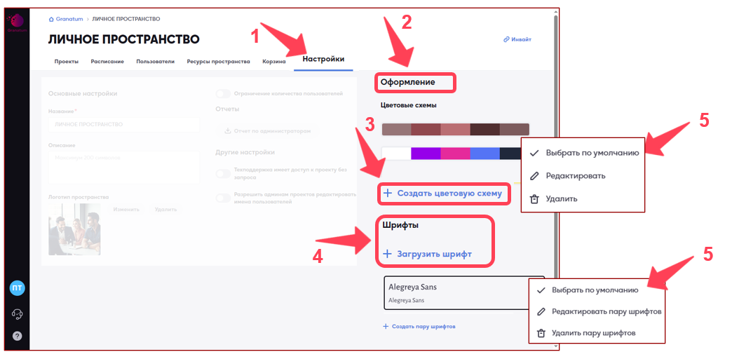 В разделе «Настройки» (1), подраздел «Оформление» (2) доступны инструменты для настройки цветовой схемы (3) и загрузки собственных шрифтов (4). Для каждого параметра можно установить значение по умолчанию (5). Если установлен параметр «Выбрать по умолчанию» (5), изменения затронут только вновь созданные сессии.