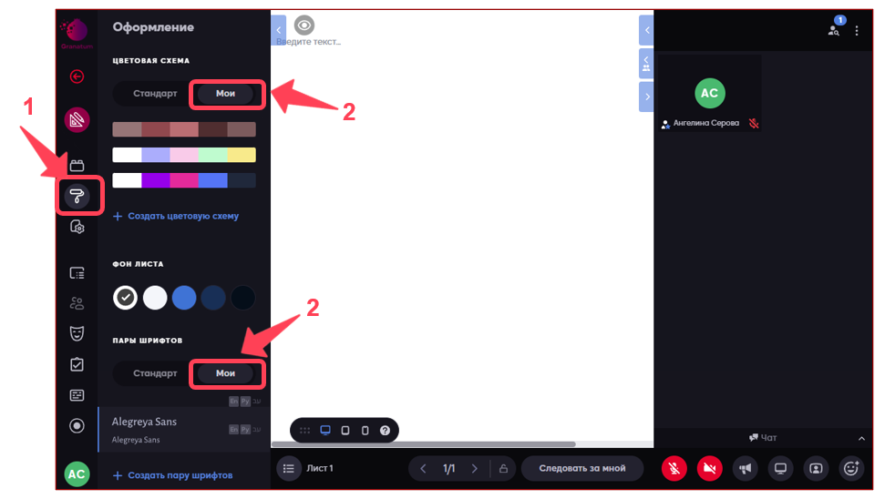 В старых сессиях тоже можно использовать установленные в пространстве оформление. Зайдите в сессию и откройте «Оформление» (1) → вкладка «Мои» (2) → выберите нужные цветовые схемы и шрифты.