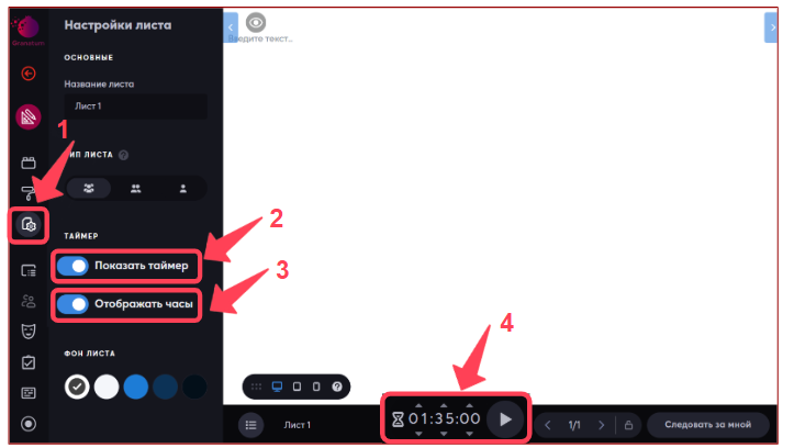 Чтобы добавить таймер на лист, перейдите в режим редактирования в левой части экрана (1), затем кнопку (2). После этого включите таймер для листа, ползунок должен стать голубого цвета (3). Далее в нижней части экрана отрегулируйте время таймера. По умолчанию установлено 5 минут.