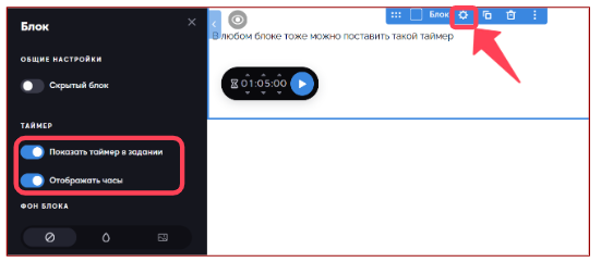 Помимо листа, таймер можно устанавливать в настройках блока и отображать часы: