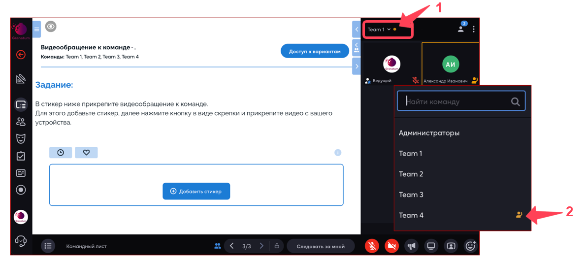 Для командного листа доступно отображение поднятой руки от участников — функция видна администратору и ведущему. Даже находясь в комнате «Администраторы», вы увидите пульсирующую оранжевую точку (1). Нажав на неё, можно узнать, из какой команды участники подняли руку (2), и сразу перейти к ним.