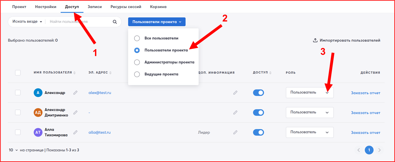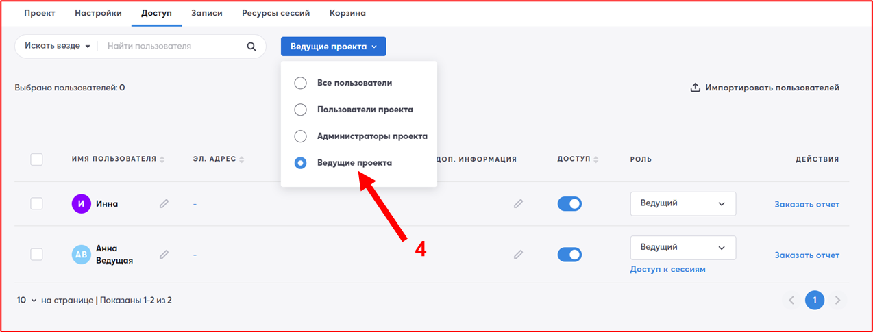 Используйте поиск по пользователю или фильтр с кнопкой «Все пользователи», затем «Пользователи проекта» (2). В столбце «Роль» (3), присвойте роль «Ведущий». Вы можете использовать фильтр, чтобы найти ваших ведущих сразу (4) и убрать доступ или поменять роль, если потребуется.