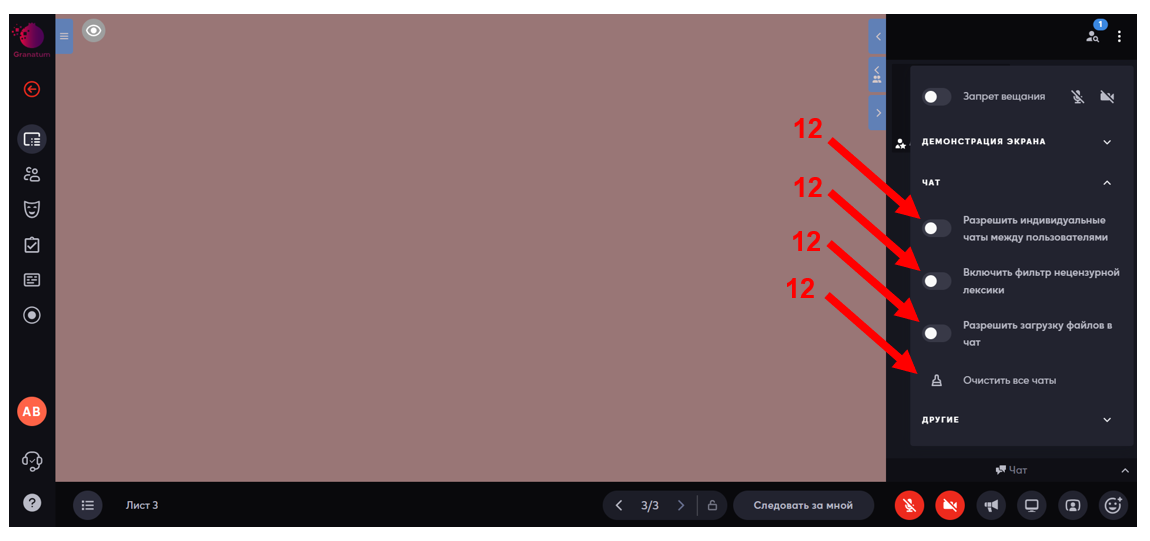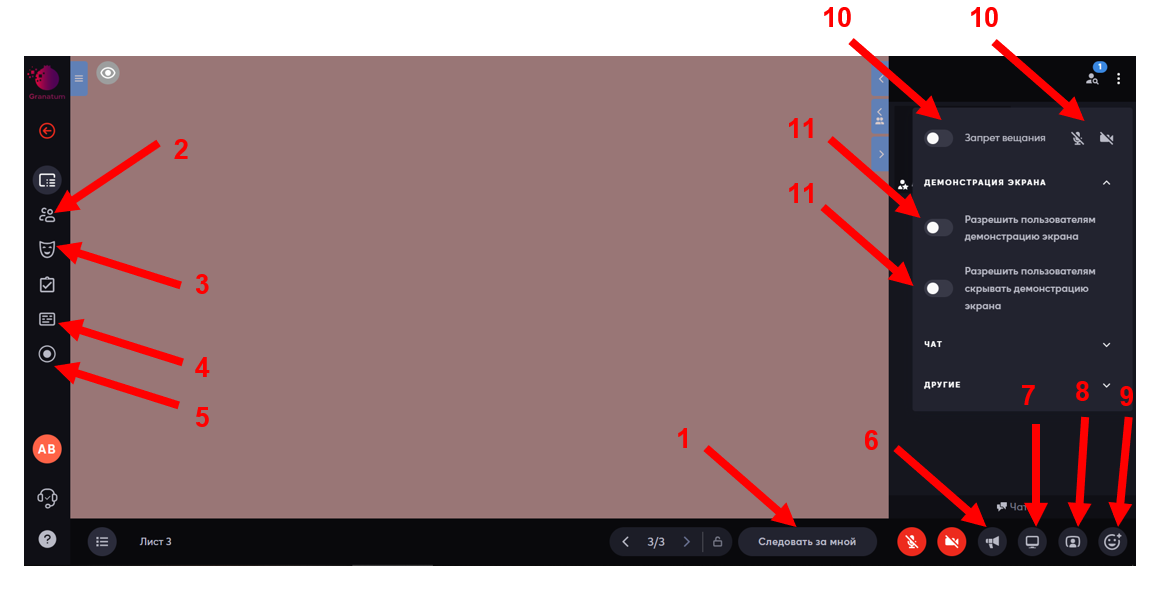- Разрешать/запрещать демонстрацию экрана пользователями (11);