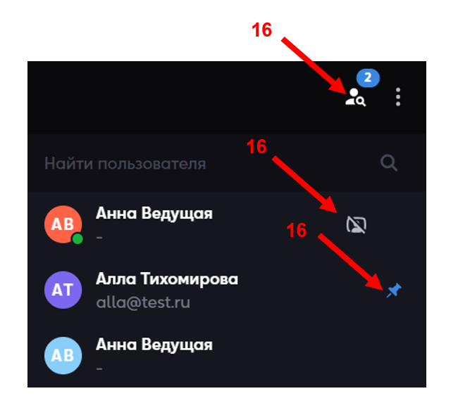 - Делать спикером и закреплять других пользователей (16).