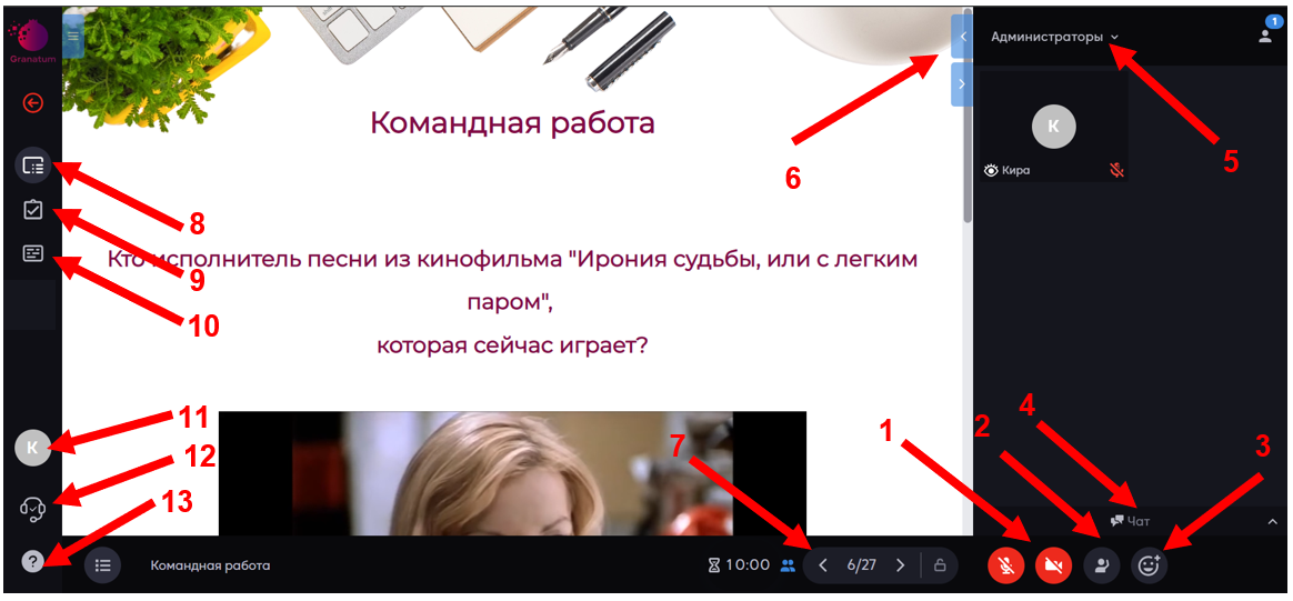 - Использовать чат (общий, администратора, индивидуальный, командный);