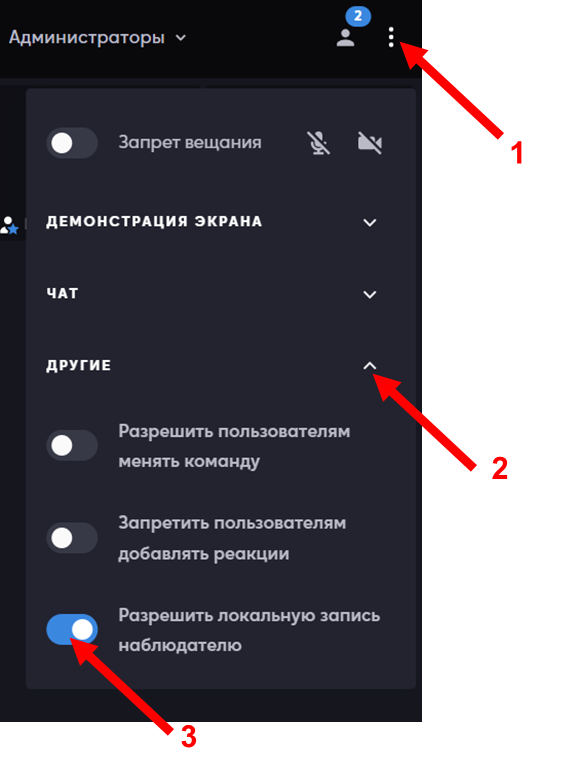 Важно! Администратор может включить для роли Наблюдатель возможность локальной записи. Чтобы это сделать, Администратор в правой верхней части платформы должен нажать на три точки (1), далее Другие (2) и Разрешить локальную запись наблюдателю (3):