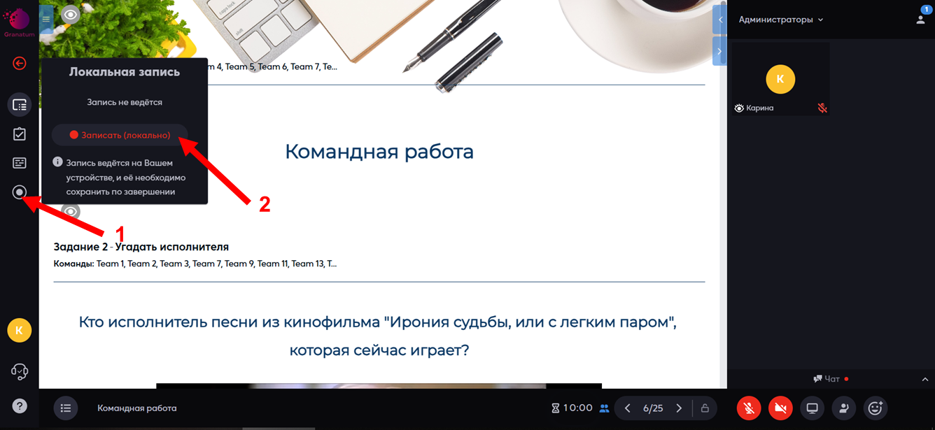 У роли Наблюдатель появится кнопка в виде круглого кружочка в левой части платформы (1) и нажав на него, он сможет поставить локальную запись (2):